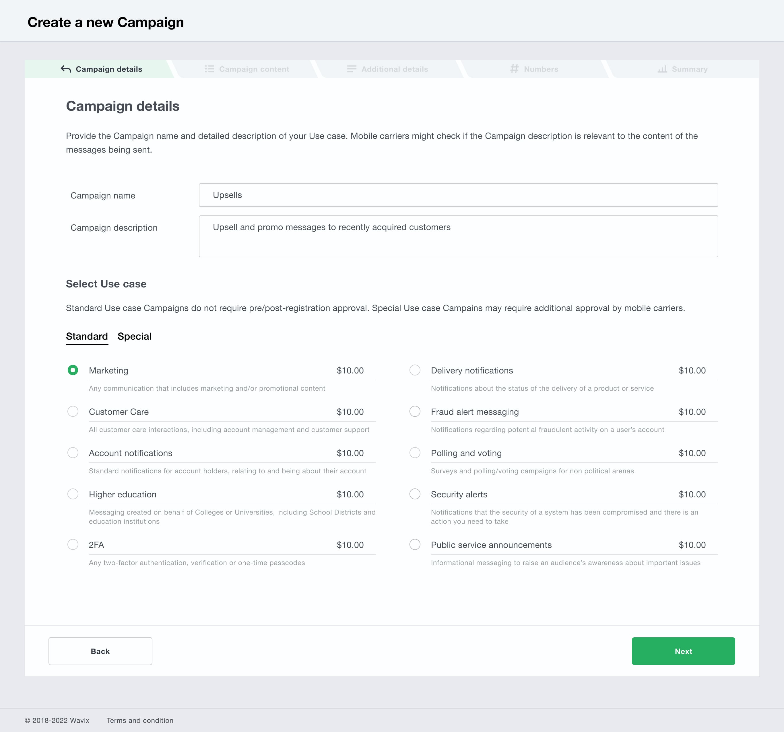Each 10DLC Campaign should describe your specific use case and the content of the SMS and MMS messages you plan to send. To register a new 10DLC Campaign, provide the following information:- Campaign name (for reference)