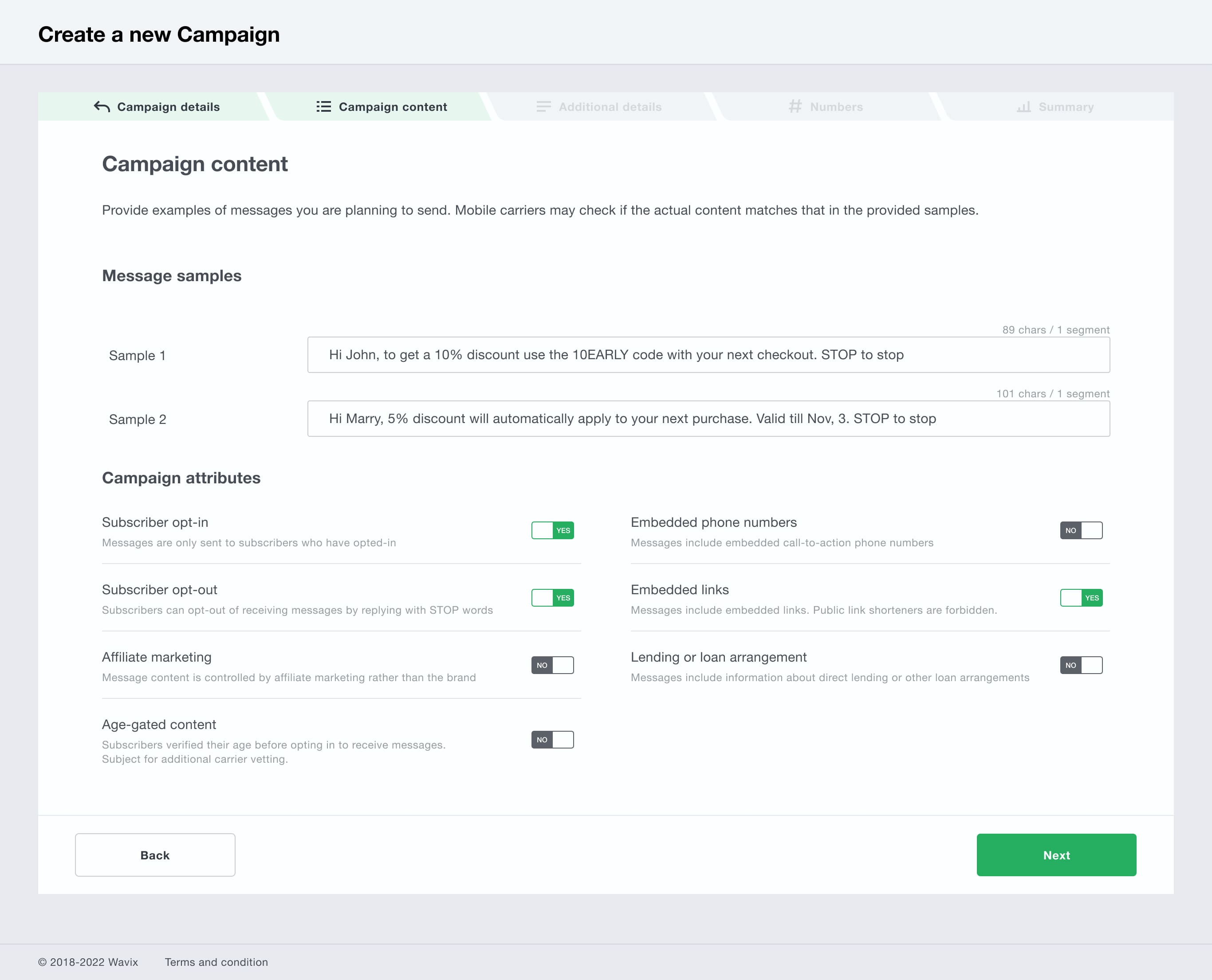 Select all Campaign attributes that apply to your Campaign and message content using the YES/NO toggle.