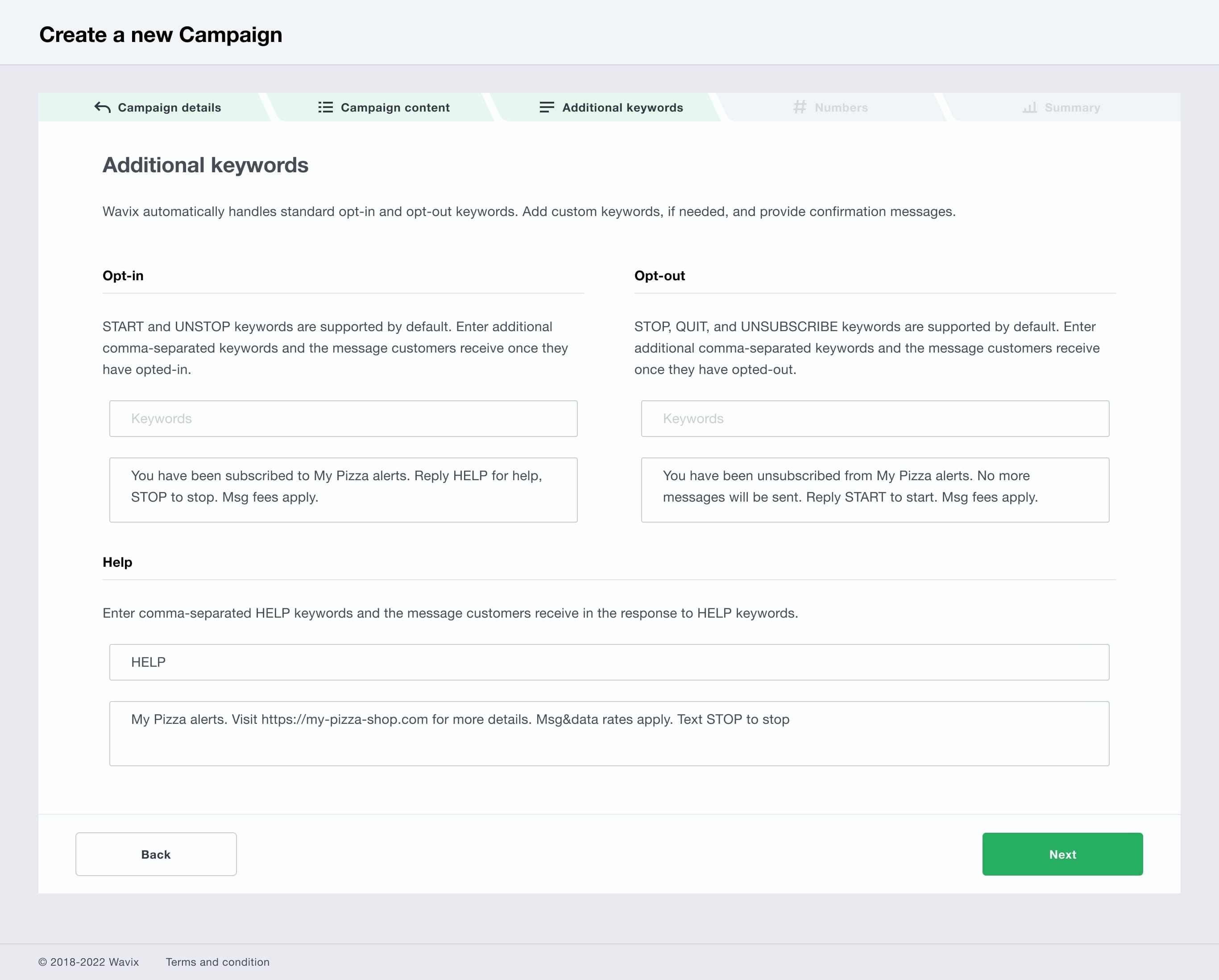Wavix supports all standard opt-in and opt-out keywords by default. All additional keywords are case-insensitive. STOP keywords:Add custom, comma-separated opt-out keywords if needed. US mobile carriers require you to provide a response (acknowledgment) when a person sends any STOP keyword. Enter the acknowledgment message your customers will receive if they opt out. START keywords: