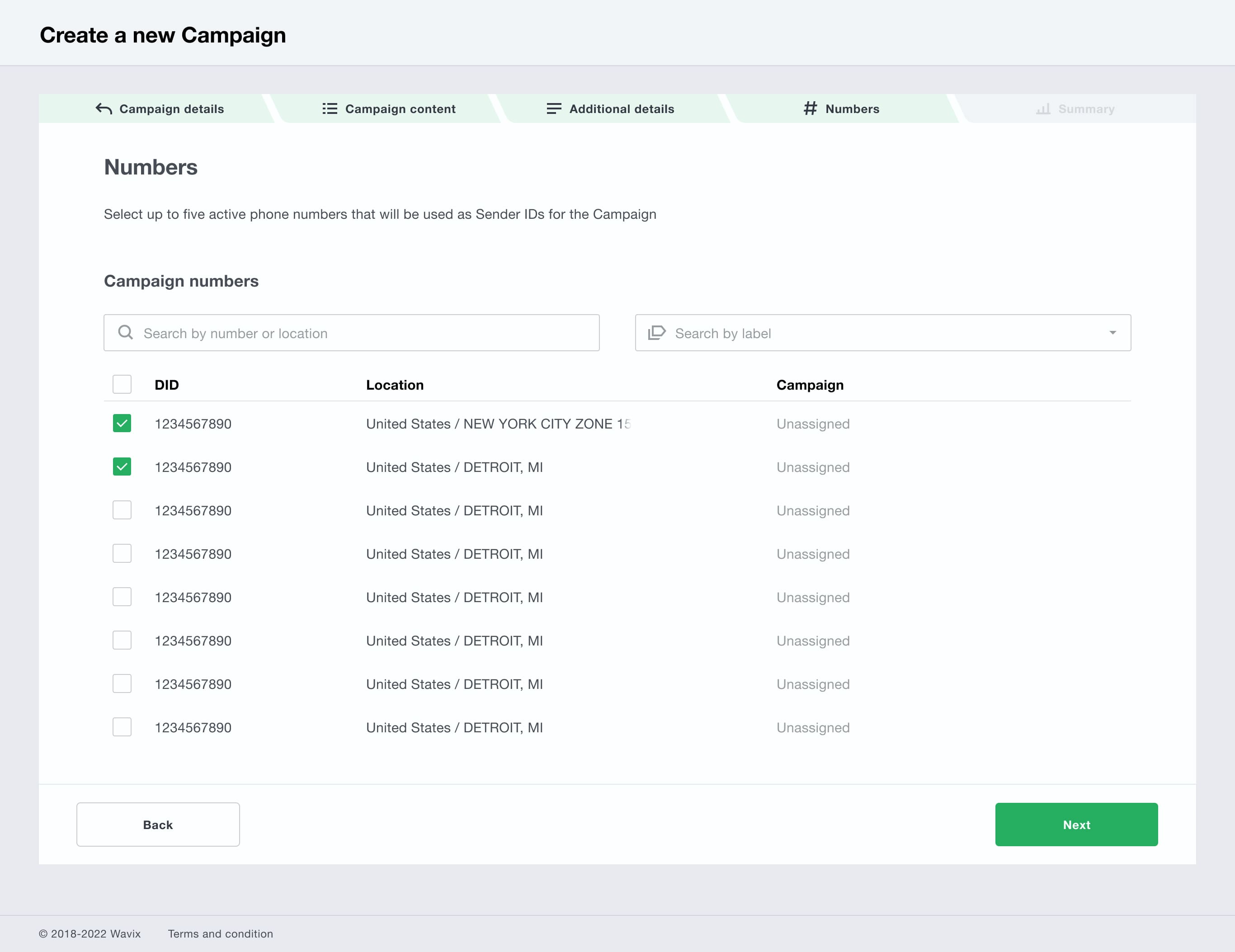 You can add up to five phone numbers to your Campaign, depending on your registration type. Choose the numbers you want to use as sender IDs and select Next.
