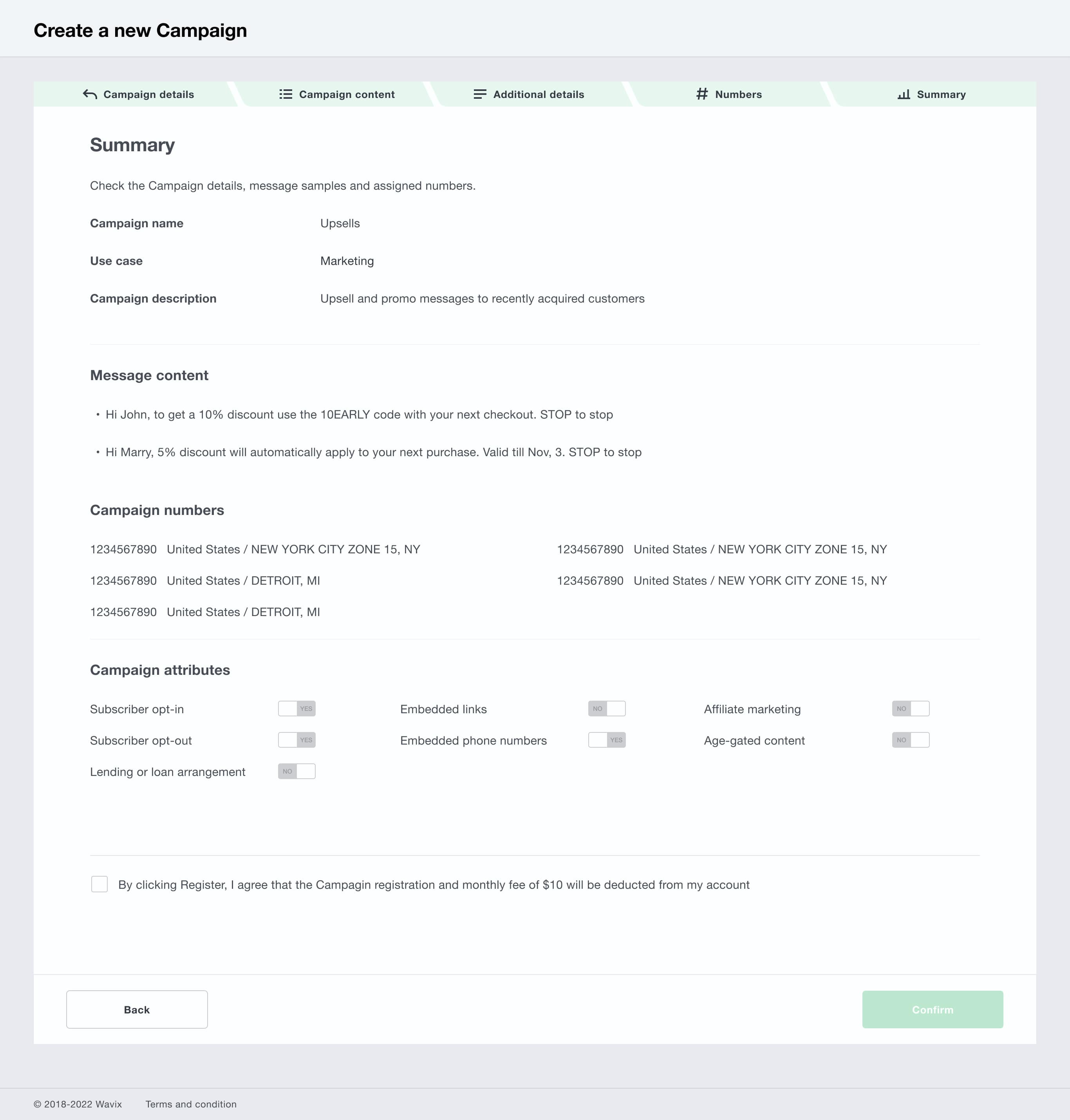 Review your Campaign details. To make changes, select Back and update the necessary fields. Select Register to complete the process.