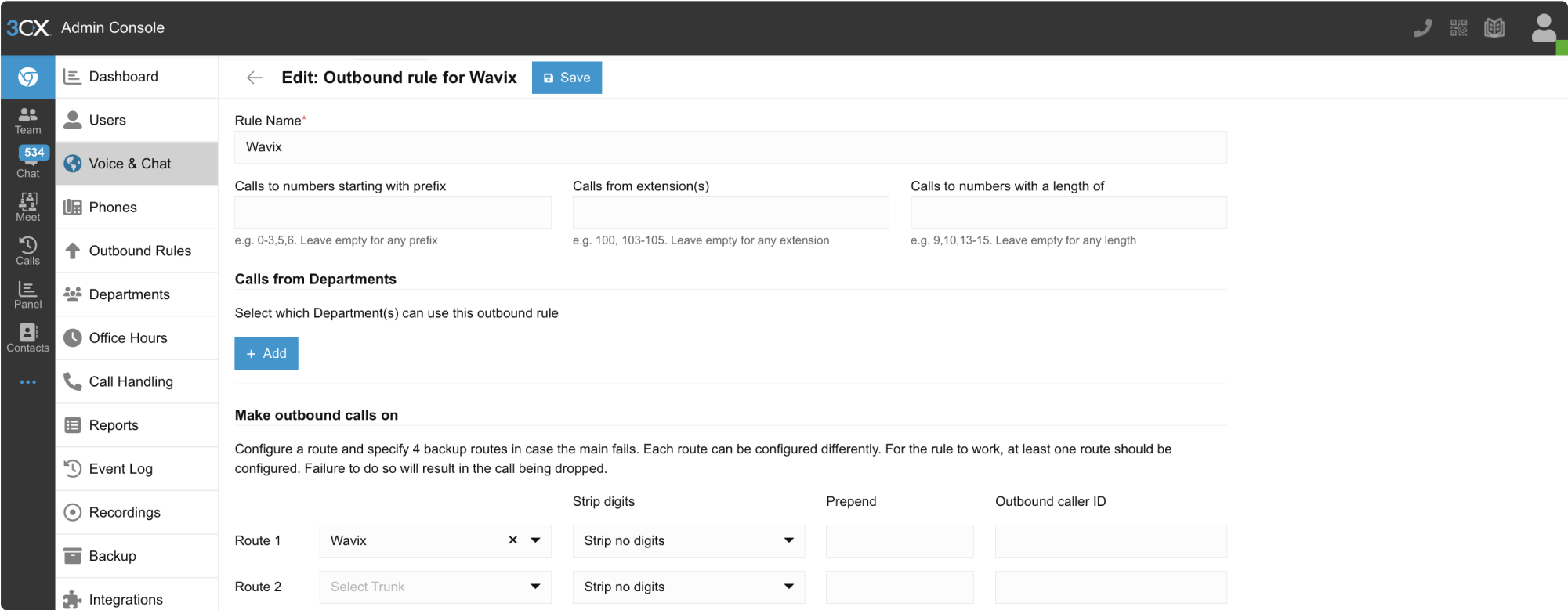 - Scroll down to the Make outbound calls on section, select Wavix, and save the Outbound Rule