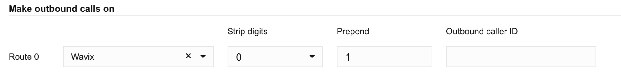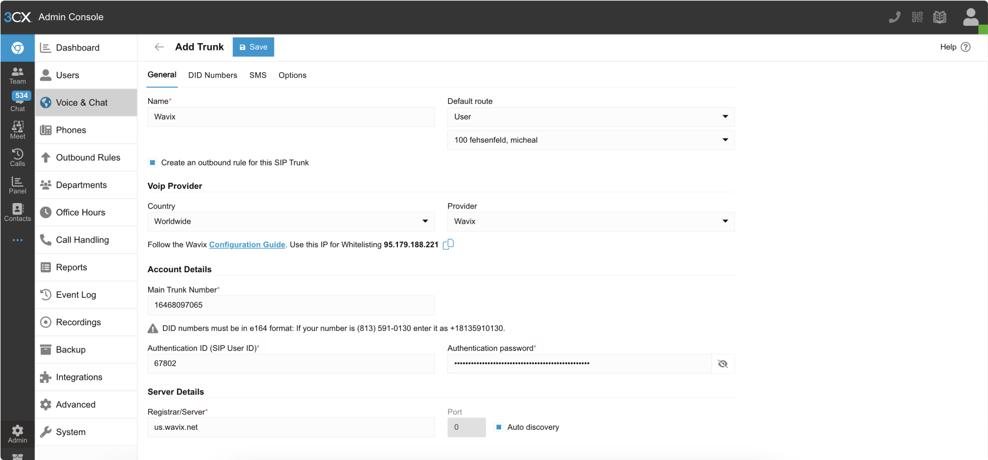 - Enter your default Caller ID into the Main Trunk Number field. The Caller ID should be an active or verified phone number from your Wavix account.