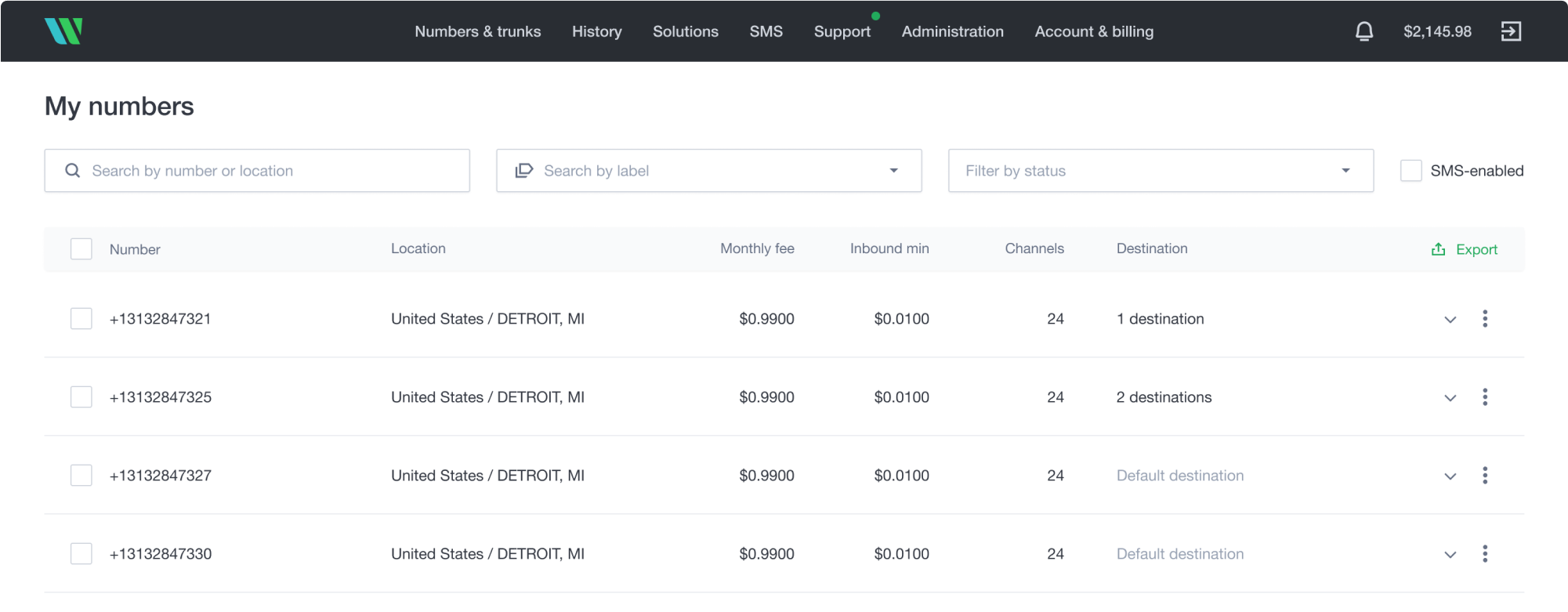 - Select My numbers under Numbers & trunks in the top menu