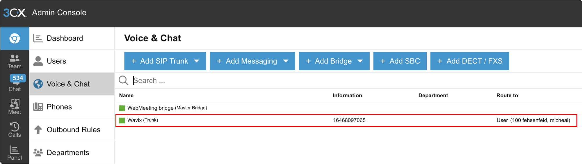 - In the top menu, go to Numbers & Trunks → Trunks.