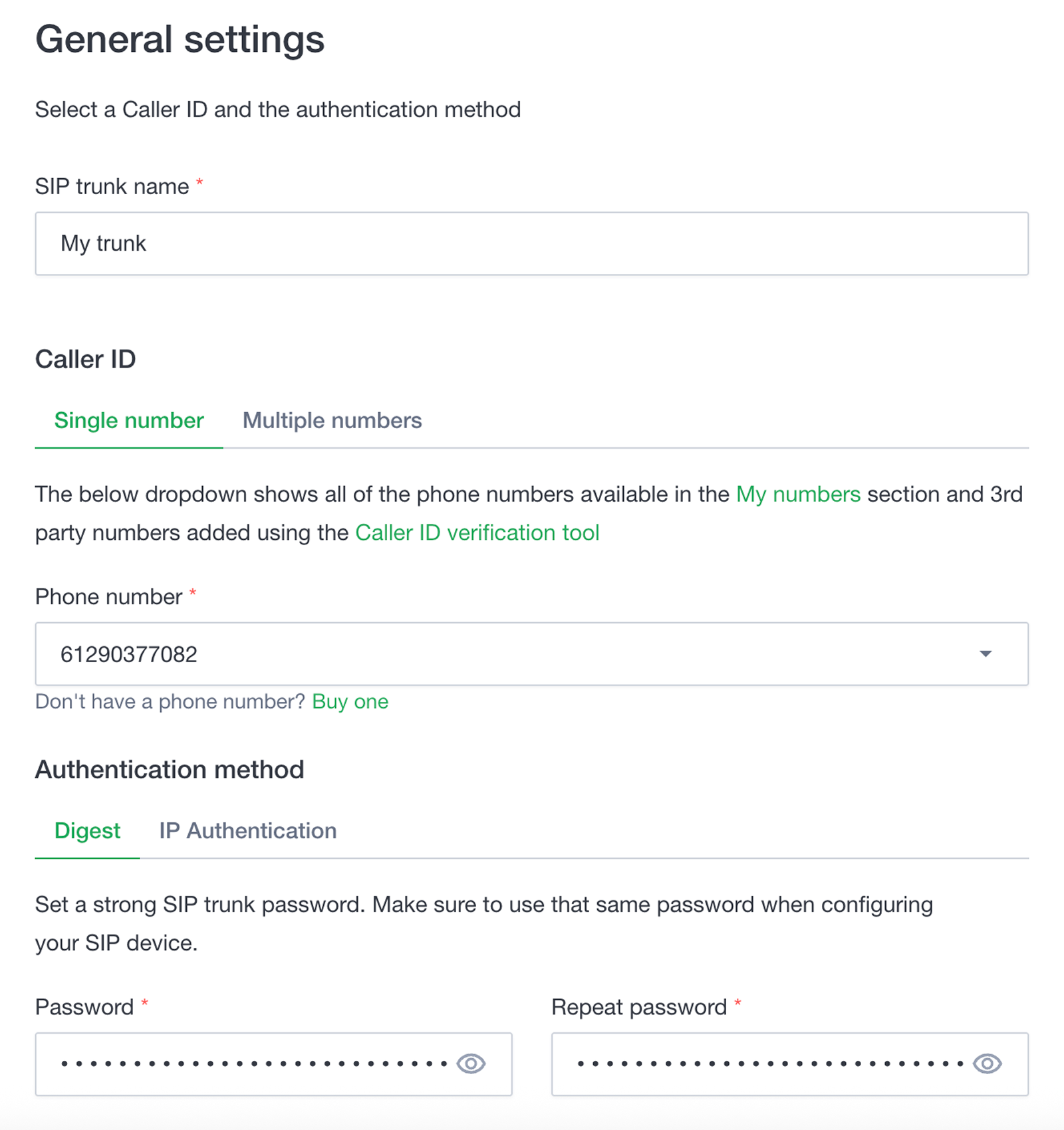 - Enter a SIP trunk name, set a SIP trunk password, and choose one of your numbers as the Caller ID.