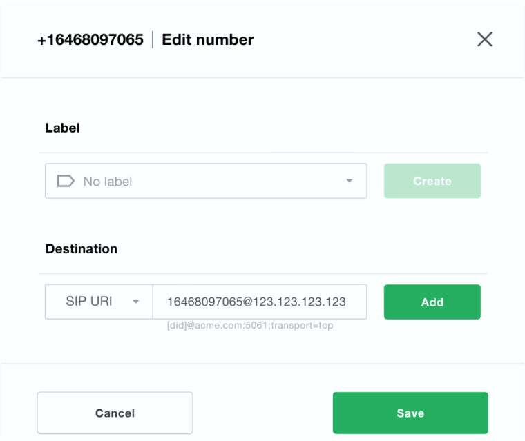 - Select SIP URI under the Destination and enter URI in the format: DID@