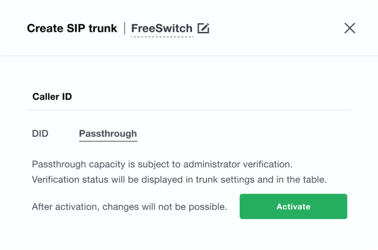 Alternatively, you can enable the caller ID passthrough option on the Wavix platform. This allows you to send your own A-numbers directly from FreeSWITCH: